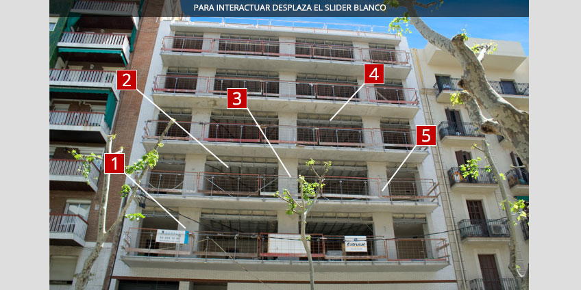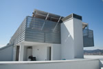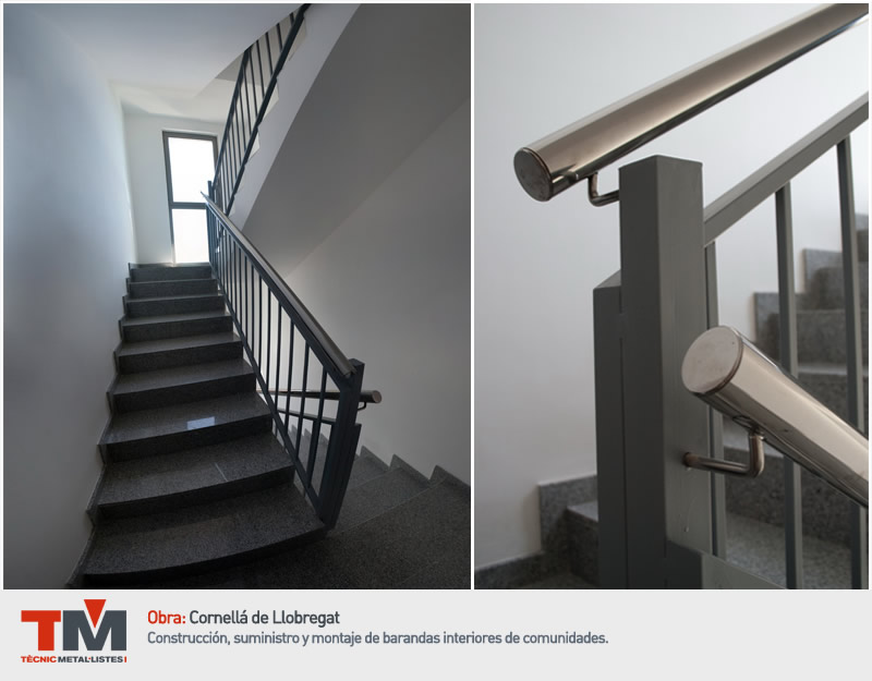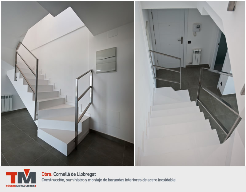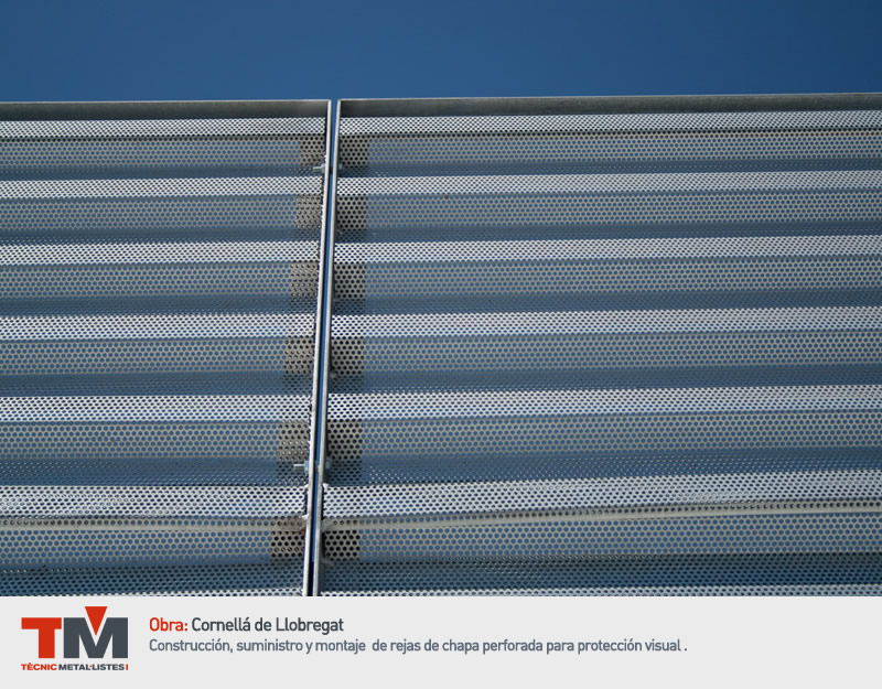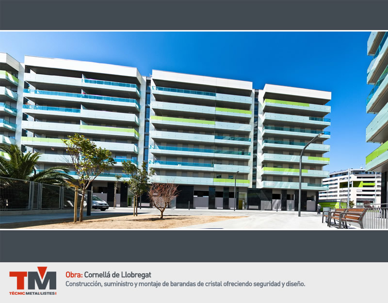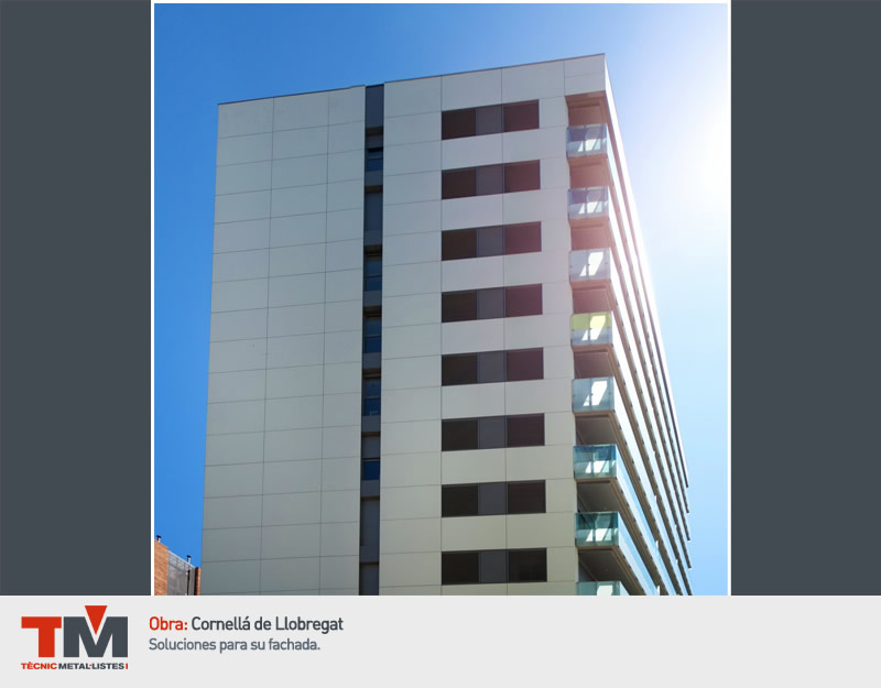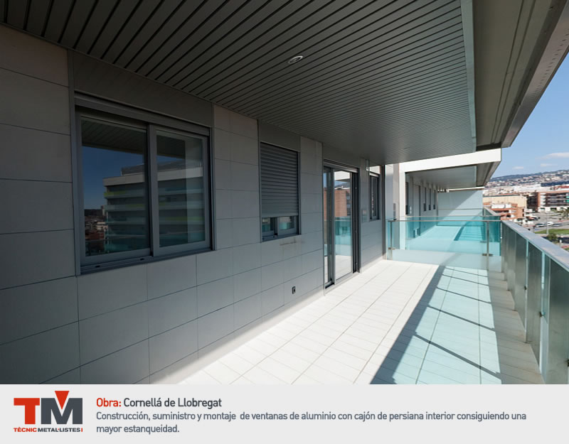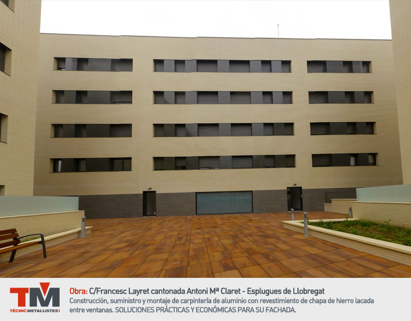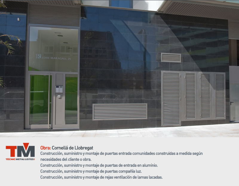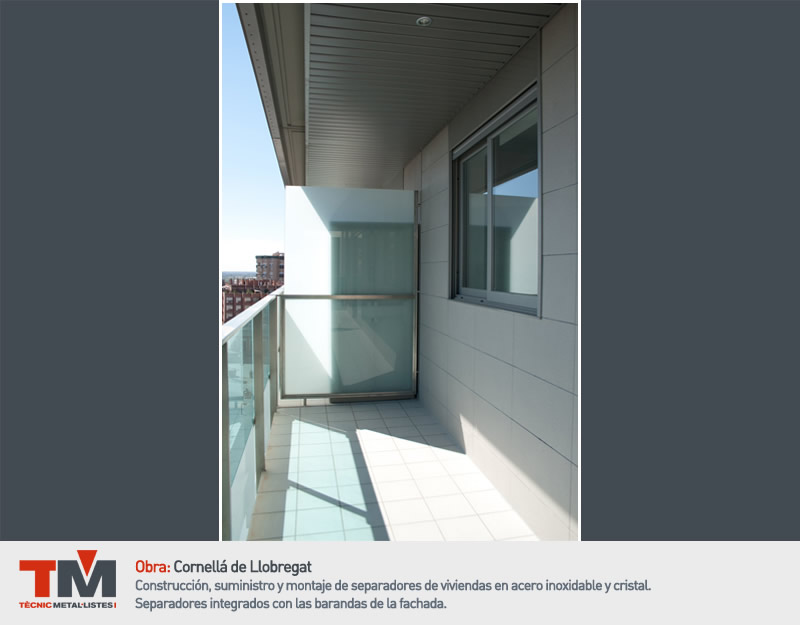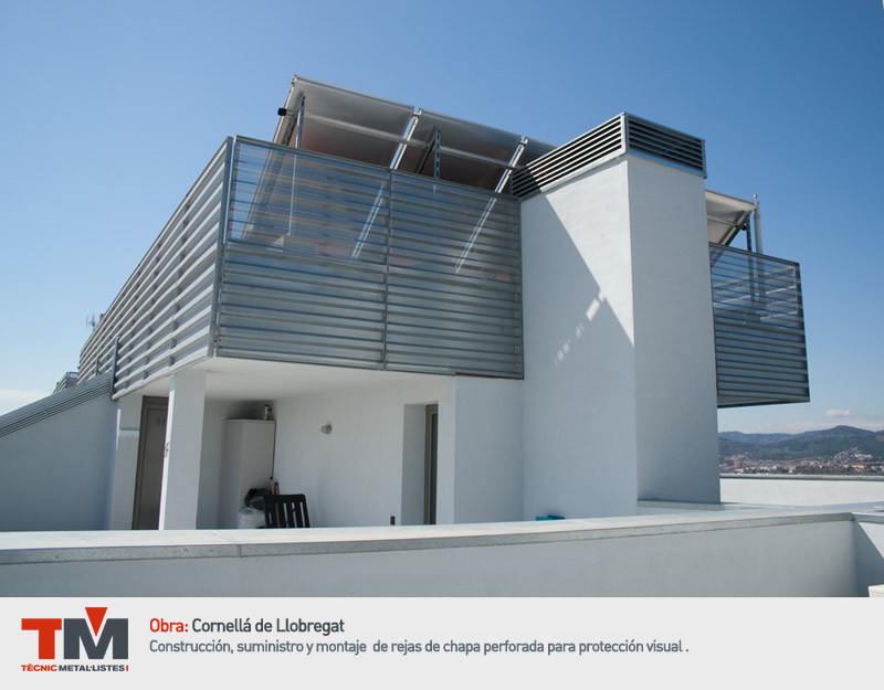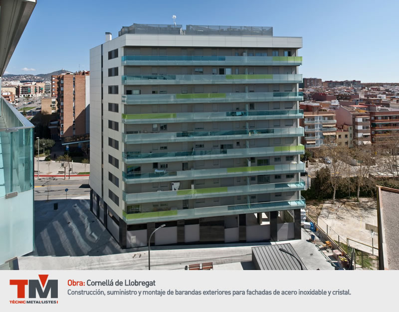 Trabajos: Construcción, suministro y montaje de barandas exteriores para fachadas de acero inoxidable y cristal. Puertas de entrada en aluminio. Rejas de ventilación. Ventanas de aluminio con cajón de persiana interior. Separadores de viviendas en acero inoxidable y cristal. Rejas de chapa perforada para protección visual.